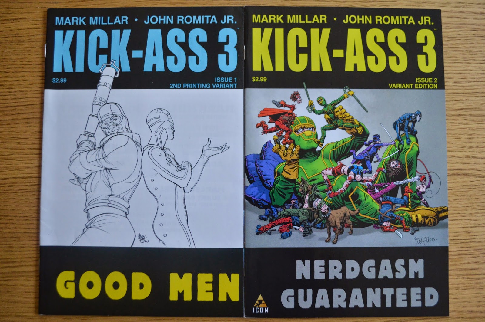 Modern Comics : Public Enemy 0, 1; Marvel Zombies 1 (3rd print variant); Marvel Zombies 2 ; Kick Ass 1 : 2 (2nd print variant), 3 (umpteenth variant), 4 (umpteenth variant), Kick-Ass 2 : 2, 2 (2nd print variant), 3, 5 (variant photo), 6 (variant photo), 7, Kick -Ass 3 : 1 (variant E), 1 (variant F), 1 (2nd print variant), 2 (variant), 8; Hit-Girl 3 (variant), 4; Power Girl 13; The Walking Dead 132.