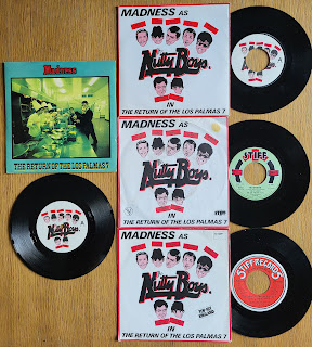 7"s : Madness"79"My Girl"(OG- Stiff Records- 6 12687- Germany)- "80"Embarrassment"(OG- Stiff Records- 6 12960- Germany)- 81"The Return of the Las Palmas 7"(OG- Stiff Records- 6 12999- Germany)- 81"It Must be Love"(OG- Stiff Records- 6 13316- Germany)- 84"Michael Caine"(OG- Double Pack- Stiff Records- 6 14072- Germany)- Bad Manners"80"Special Brew"(OG- Magnet- 6 12835- Germany).